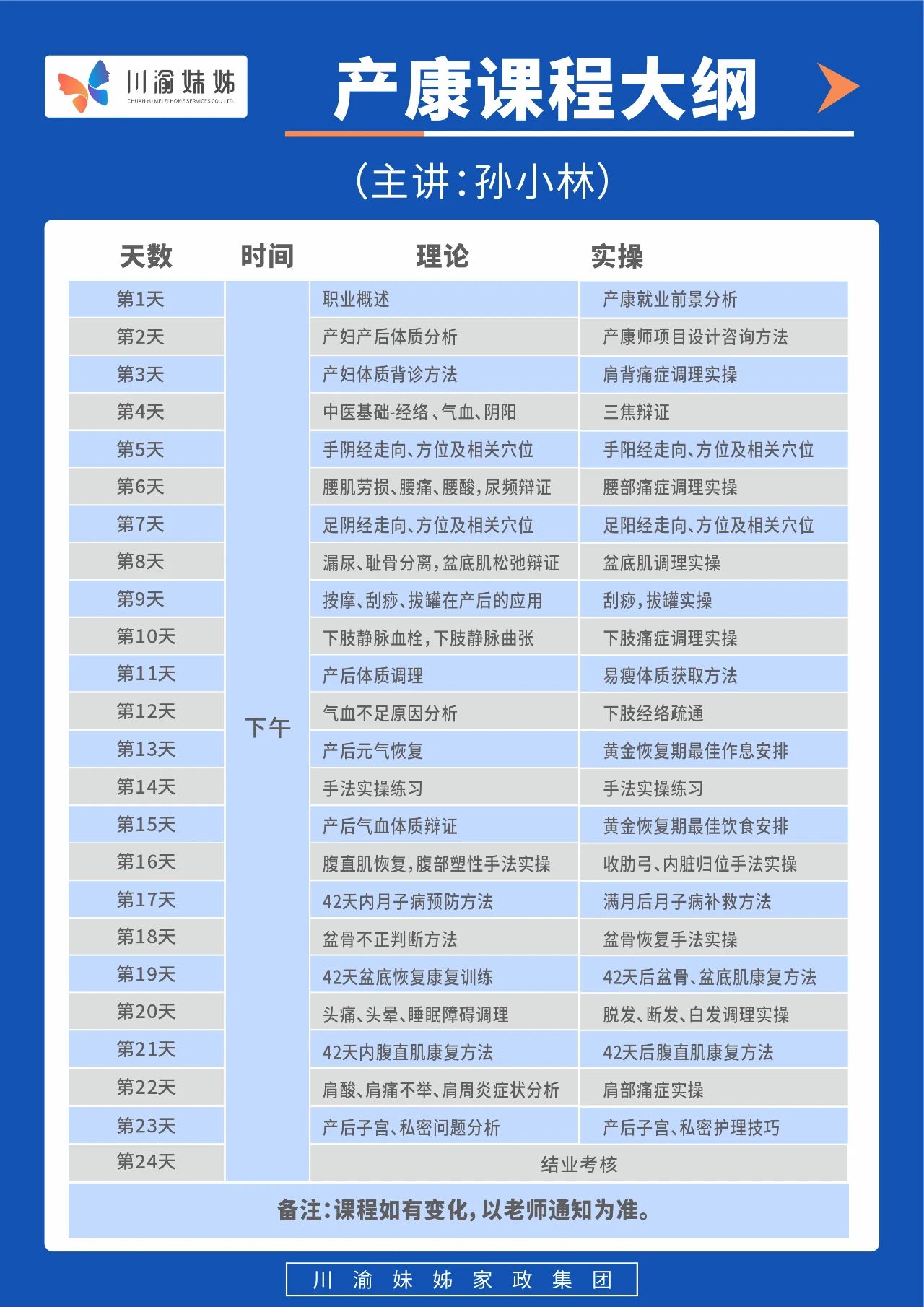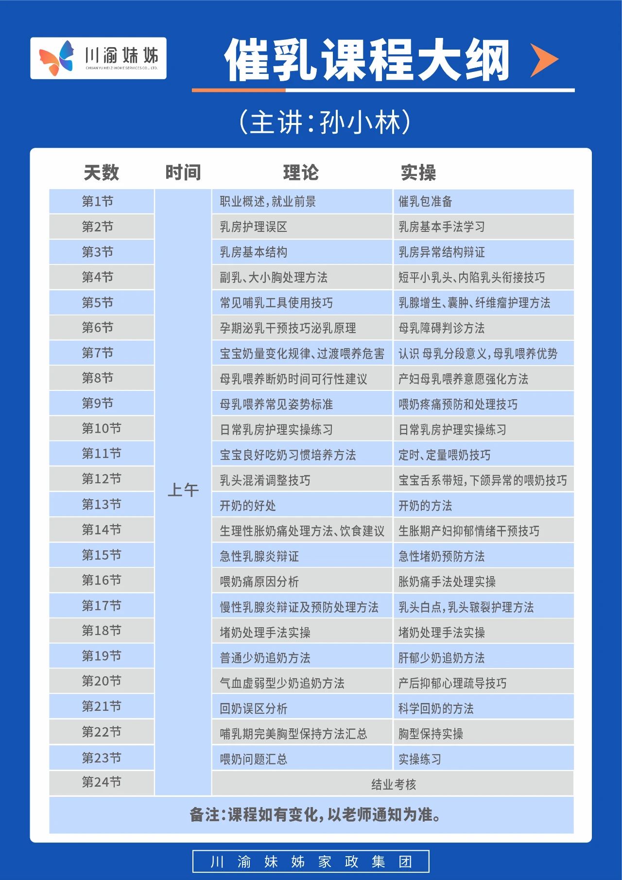 整个课程时长为24节,累计12天,上午9.00-12.00(催乳),下午1:30-5:00(产康),课程将以理论+实操的形式进行。