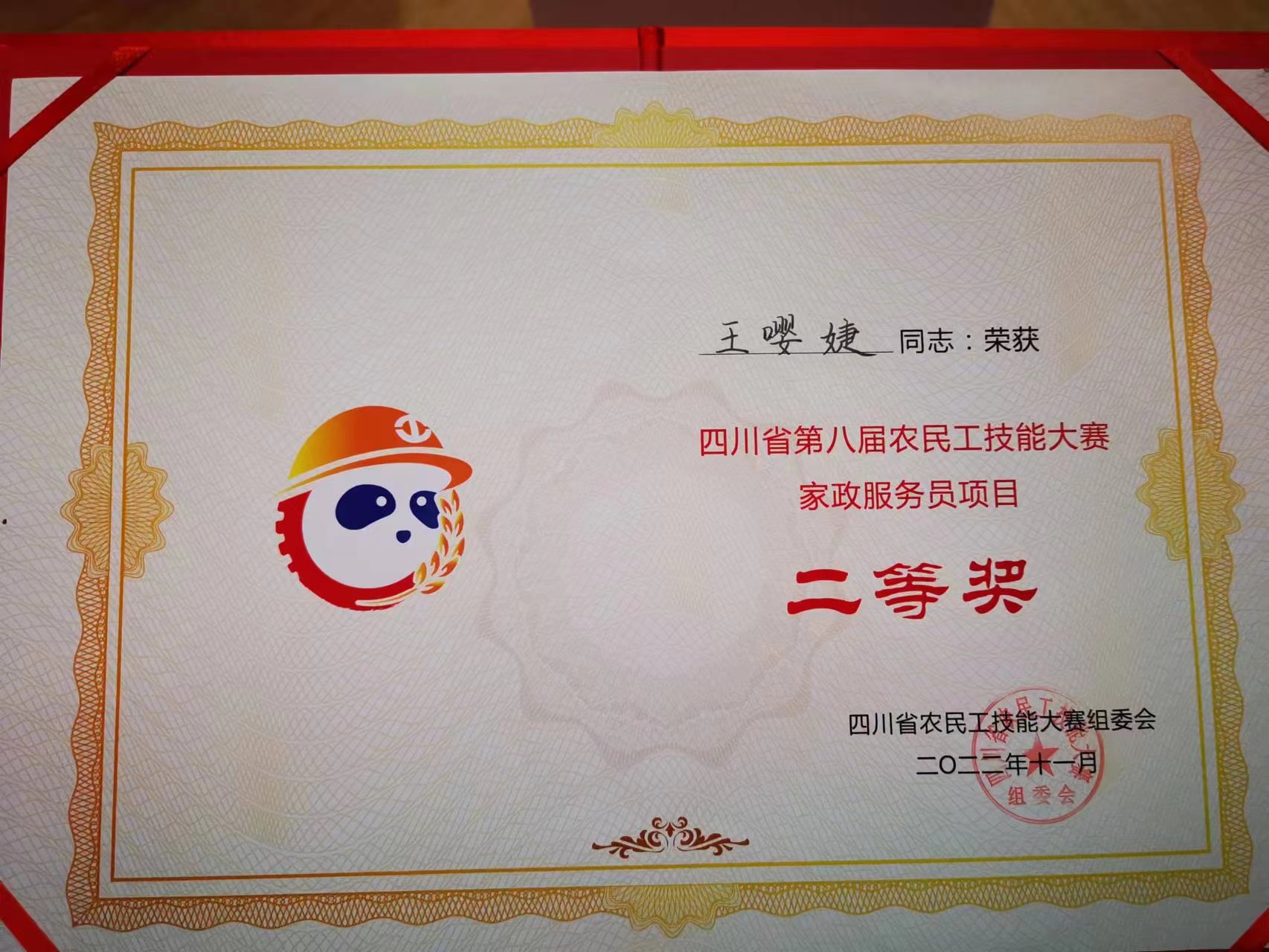 四川省第八届农民工技能大赛家政服务员二等奖