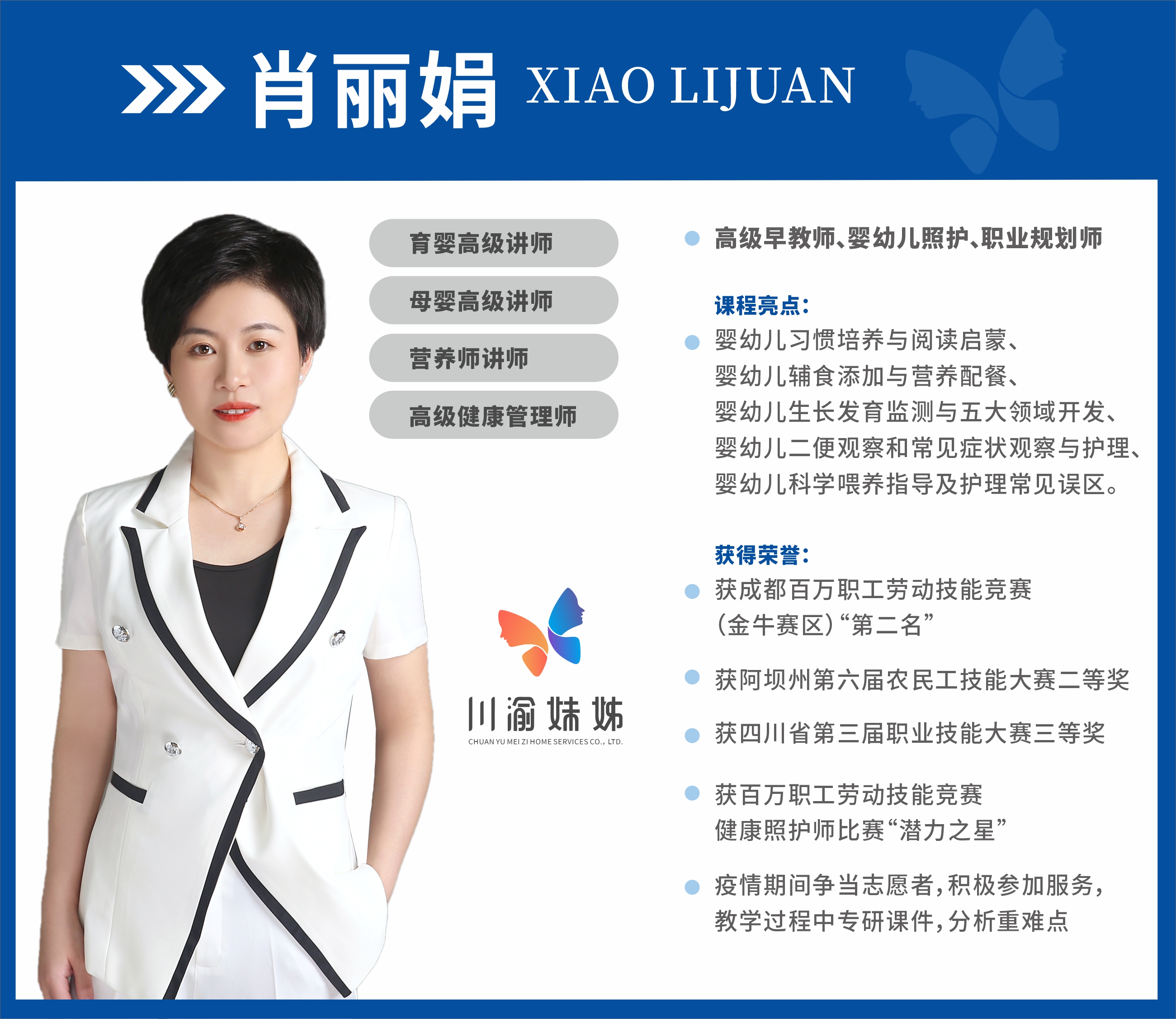 育婴高级讲师母婴高级讲师营养师讲师高级健康管理师高级早教师、婴幼儿照护、职业规划师课程亮点:婴幼儿习惯培养与阅读启蒙婴幼儿辅食添加与营养配餐、婴幼儿生长发育监测与五大领域开发、婴幼儿二便观察和常见症状观察与护理婴幼儿科学喂养指导及护理常见误区获得荣誉:获成都百万职工劳动技能竞赛(金牛赛区)“第二名获阿坝州第六届农民工技能大赛二等奖获四川省第三届职业技能大赛三等奖获百万职工劳动技能竞赛健康照护师比赛“潜力之星